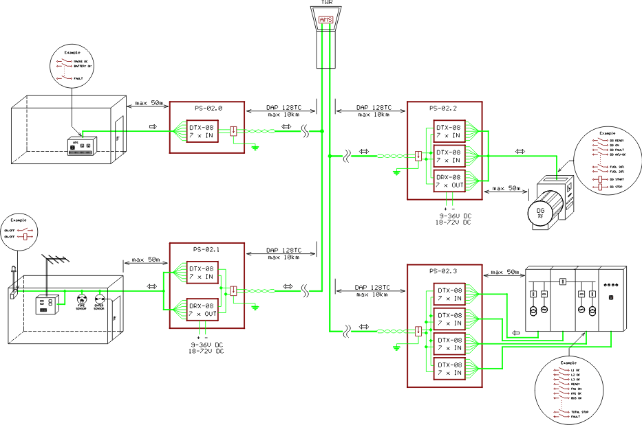 - dálkové monitorování a ovládání různých technologických zařízení (rozváděče, dieselgenerátory, UPS, energetická zařízení, ochrana objektů, radionavigační zařízení atd.) pomocí přenosového systému DAP 128TC